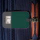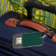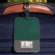 The Luggage Tag features a calm design in green and natural tones. A subtle artistic illustration is printed: a man sitting cross-legged in a classic yoga pose.