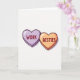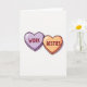 This card features two puffy, heart-shaped candy pieces that look like classic conversation hearts. The left heart is light lavender with a slightly shiny surface, and it has the word “WORK” printed across the center in reddish-brown block letters. The right heart is a soft, muted orange with the word “BESTIES” in the same reddish-brown block letters, also centered. Both hearts have dark, slightly uneven outlines that make them feel hand-drawn and friendly. They sit against a simple off-white background, keeping the focus on the sweet message. The overall look is warm and a little funny, like a nod to the friends you count on every day at work ❤️💌🍫.