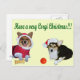 Denna vykort presenterar två av våra landCorgivalper, förskoning och Gimli, på ett ljust - gul bakgrund som ha på sig "Santa" tillbehör. En röd boll och en hundkex avslutar designen tillsammans med ord, "har mycket jul för en Corgi" över det bästa.