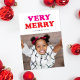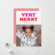 Detta roliga semestern fotokort har enkel retroinspirerad typografi i varmt rosa och rött med vit bakgrund. Denna design rymmer ett enda, fyrkantigt foto på framsidan av kortet. På baksidan hittar du ett festligt rött och vitt diagonalt randmönster som kan tas bort eller ändras. Du kan lägga till ett annat foto eller text på baksidan genom att välja "anpassa ytterligare" alternativ.