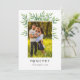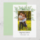 Eleganta vattenfärgkvistar med gröna blad bakom ett familjefoto på detta enkla julkort.