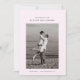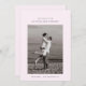 Kortet med datum för att spara har ett enda, centrerat foto av paret. Ovanför fotot visas deras namn i en ren, modern typsnitt. Nedan är bröllopsdatum och plats snyggt skrivna. Designen är minimal med gott om vitt utrymme, med fokus på enkelhet och elegans.
