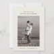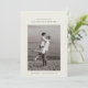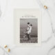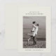 Kortet med datum för bröllopet har ett enda, centrerat foto av paret. Ovanför fotot visas deras namn i en ren, modern typsnitt. Nedan är bröllopsdatum och plats snyggt skrivna. Designen är minimalistisk med gott om vitt utrymme, med fokus på enkelhet och elegans.