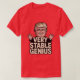 En sarkastisk politisk t-shirt med frasen "mycket stabilt geni" i fet gemener med nöd stil, överdragen över en tecknad-stil-karikatyr av Donald Trump med överdrivna inslag. Konstruktionen har en grym struktur och en röd bakgrund för fet kontrast och humor.
