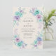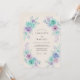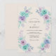 Denna design presenterar en diskret arrangemang av akvarellrosor i uppfriskande nyanser av mintgrönt och mjuk lavendel. Frodig lövverk i dämpade teal- och lila nyanser skapar en luftig, romantisk atmosfär mot en varm elfenbensvit bakgrund. Den handmålade estetiken fångar en drömsk känsla, perfekt för ett sofistikerat men ändå eteriskt evenemang. Varje blomrendering görs med mjuka färgskiftningar för att framkalla en känsla av tidlös elegans.