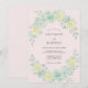 Diskret myntingrön lövverk omger mjuka, smörgula blommor och skapar en lugn och romantisk atmosfär. Denna akvarelldesign frammanar en mjuk, naturlig känsla som är perfekt för en vår- eller sommarhögtid. Den luftiga kompositionen antyder elegans och underdriftad skönhet.