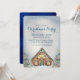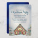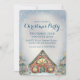Den här anpassningsbarnas julfest- eller julinbjudan har en varm och mysigt vinterscen. En liten stuva visas i mitten mellan två dekorerade Julgranar. Utsmyckningarna på träd accentueras med faux guld glitter. Bakgrunden är vacker och fallande snö.