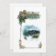 Varm och mysigt stuga på vintern med snö på marken och i ornet, elegant guld och grönt julhälsningar omgivna av vivel. Baksidan har kompletterande grafik och redigerbar fält.