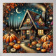 Ett charmerande trähus omgivet av glödande pumpor och vibrerande blommor under ett stjärnliv, mystiskt himmel med autumnala nyanser och ett halvmåns måne, skapande en varm och magisk säsong-scen.