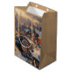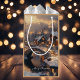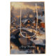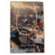 En julklapp med en vattenfärgad illustration av en månbelyst by på en snökväll med en flodvåg som går genom ljusbelysta stenburkar och charmeringsstenar som går broar och vidhäftade mjuka helgdag. God jul hälsning visas på säckens framsida och baksida. Hälsning kan ändras till din inställning eller tas bort helt.