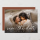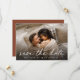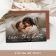 Meddela ditt bröllop-datum i ett oförglömligt stil med det här enkla fotot och fotofotot av chicen som sparar datumkorten och som innehåller ett vågrät eller ett landskapsinriktat foto med fullt "spara datumet" som är täckt av ett vitt skript längs grund. Din namn, bröllop-datum och bröllop-plats visas under modern text. Anpassa baksidan med ytterligare information, t.ex. webbplatsen bröllop.