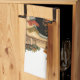 Kökshandduk med en varm och mysigt illustration med en gammaldags kamera. Det hänger med försiktighet. Garland hänger över manteln. En varm eldbrand i hjärtat.