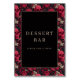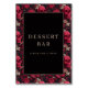 Denna bröllopsbordsskylt har ett slående gotiskt och vintage blomster tema, med en central svart panel infattad av intrikata röda rosor och alternerande dödskallar. Färgpaletten inkluderar djupa röda, mörka rosa och dämpade gråa nyanser som skapar en mystisk men ändå sofistikerad stämning. Designen är digitalt illustrerad och erbjuder rena linjer och solida fyllningar som framhäver motivens makabra elegans. Den klassiska serif-typografin läser "DESSERT BAR" och "PLEASE TAKE A TREAT!" i en inbjudande ton, vilket gör den perfekt för att lägga till en lekfull kant till din evenemangsinredning.