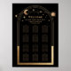 Mystical Black Rosa Sol Stars Astronomy Bröllop Seating Chart Bröllop Poster Prints har guld sol, Måne och stjärnor måne på svart bakgrund. Inuti ram finns texten "Välkommen" i kalligrafiskriptet för elegant guld och informationen i personligt bröllp-mottagningsdiagrammet. Designad för dig ©2022 Evco Studio www.zazzle.com/store/evcostudio