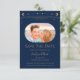 Mystical Blue Guld Sol Måne Star Space Sparar datumet en ram i sol, måne och stjärnor i guld på en mörk marin blå bakgrund. Inuti finns ditt favoritfoto och din anpassningsbar sparar datuminformationen. Anpassa genom att redigera texten i textrutorna. Designad för dig ©2022 Evco Studio www.zazzle.com/store/evcostudio