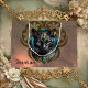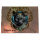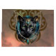 Mystical cat of Egypt, black as night, radiant as the sun. This black cat has striking, bright green eyes that immediately draw attention. The cat's head is set against a backdrop of stylized floral patterns in muted gold tones, creating a harmonious connection to ancient Egyptian aesthetics. The cat is adorned with elaborate Egyptian jewelry: gold necklaces, headbands, and earrings, decorated with turquoise stones that create a vibrant contrast with its black fur.