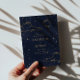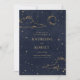 Mystical celestial bröllopsinbjudan med vackra guld-halvmånsfärande måne, stjärnor och moln på en midnattsblå bakgrund parad med elegant typsnitt för personlig. Inbjudan kommer i olika bakgrunder, färg, burgundi och svart, som du hittar i vår butik.