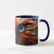 Ett sjudande kaffe mugg med en konstnärlig återgivning av uggla ansikte med intensivt ögon, omgiven av autumnhuber och en liten silhuett av en fågel som genomborras på ett texturerat gren. Användan färg och struktur gör denna fråga både praktisk och konstnärlig biet.