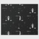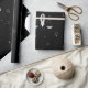 A chic celestial pattern wrapping paper celebrating the Libra zodiac sign, featuring an elegant goddess figure holding the scales of balance. Set against a deep black background with minimalist white linework, moons, stars, and astrological symbols, this seamless design embodies harmony, beauty, and cosmic energy.