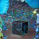 Djupblå och tealdammliknande specialruta med ljusa guldstjärnor.