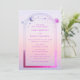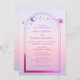 Mystical Sunset Rosa Sol Måne Star Astronomy Space Weddings inbjuds med en rosa och lila sol, måne och stjärnor ram på en pastellstrand med solnedgång. Inuti finns din inbjudan till personligt bröllp. Anpassa genom att redigera texten i textrutorna. Designad för dig ©2022 Evco Studio www.zazzle.com/store/evcostudio