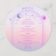 Menykort för Mystical Sunset Rosa Sol Stars Space Bröllop har en rosa och lila sol, måne och stjärnor Måne på en solnedgång i pastellstranden med menydetaljer i mitten i det moderna kalligrafiskriptet för ram. Anpassa genom att redigera texten i textrutorna. Designad av Evco Studio www.zazzle.com/store/evcostudio