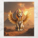 Mystical Winged Cat Sphinx - Egyptian Fantasy Art. En stor kattliknande sfinx med gyllene vingar ligger på ett skickligt sätt i ett ökenlandskap, präglat av pyramider och en glödande solnedgång i himmel. Den här mystiska förmyndaren är försedd med gammal egyptisk smycken och royalets heaadress. Den här teckningen blandar ihop egyptisk mytologi, fantasi och kattdjur elegans - perfekt för kattälskare, mytologi fläkt och dem som njuter av magisk konst och andlig.