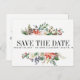 Utkastad för att samordna med vår Mystical Winter - vattenfärg blommig brölloppskollektion, Omgiven av ömtåliga målade vinterblommor, julstjärna och kotte och placerad på en vit bakgrund, är denna design iögonfallande och mycket vacker. Modern och enkel "save the date" postkort visas i mitten bland bladverket och en mall-postkort finns på baksidan. Alla textstilar, färger, storlekar kan också ändras för att passa dina behov