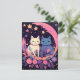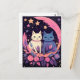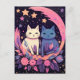 Ett charmerande vykort med två mystiska katter omgivna av blommor, stjärnor och ett halvmånsfärande måne, perfekt för att skicka fantastiska vibes till dina kära.