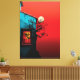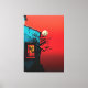 Detta suggestiva konstverk fångar en fängslande skymningsscen som blandar det tilltalande i naturlig och arkitektonisk skönhet. En rustik blå vägg, vittrad av tidens tand, har ett livfullt rött fönster som utstrålar ett varmt gyllene sken inifrån, vilket frammanar en känsla av mystik och nostalgi. Ett knotigt, bladlösa träd sträcker sina mörka grenar mot den karmosinröda himlen, där en lysande, blek måne kastar sitt eteriska ljus över scenen. Kompositionen förenar surrealism med uttrycksfulla färgkontraster, vilket skapar en visuellt slående balans mellan värme och intensitet.