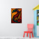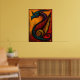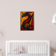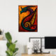 En djärv drakporträtt gjord med rå expressionistisk linjearbetning, spiralsymbolik och strålande färgfältblock. Den böjda siluetten, livfulla kontraster och mystiska närvaro skapar ett slående stycke modern fantasiväggkonst som blandar kraft, elegans och samlarbar visuell påverkan.