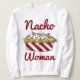 Med en originalmarkörillustration av ett fack med nachos som fyllts med ost, surgrädde och paprika och NACHO WOMAN med ett rött typsnitt av roligten.