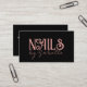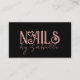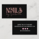 En redigerbar nagel-teknisk visitkortsmall som har ett sött rosa-hjärta, social-mediahandtag och vintage- och skripttypografi på en svart bakgrund.