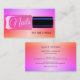 Professionell nageltekniker tittar affärskort med gradientutskrift i trendig rosa och orange glitter med nagel flaska.
