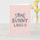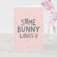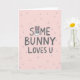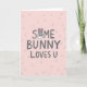 Denna design visar en pastellrosa bakgrund med stora, rundade sans-serif-bokstäver i vitt som lyder “SOME BUNNY LOVES U”, vilket ger meddelandet en söt, vänlig ton 🐰. Orden är centrerade och tar upp större delen av utrymmet, med frasen staplade så att det känns nära och mysigt, som en lapp avsedd för någon speciell. I ordet “SOME” ersätts “O”:et med ett enkelt kaninansikte, som om kaninen tittar in i meddelandet med en mild, tillgiven blick. Kaninen är ritad med ett runt vitt ansikte, små svarta prick-ögon, en liten näsa, svaga morrhår och höga öron med mjuka rosa inre detaljer 🐇. Runt bokstäverna är små blekgula femuddiga stjärnor spridda löst, vilket ger en lätt, drömsk touch utan att stjäla uppmärksamheten från orden. Den begränsade paletten av rosafärgad, mjukgrå och krisp