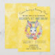 Fira din lilla enes första födelsedag med vår söta inbjudan med gul akvarellbakgrund och en söt akvarellkanin omgiven av pastella blommor och grönska. Det högkvalitativa kartongpapperet och de livfulla färgerna gör att denna inbjudan sticker ut från mängden. Personifiera den med dina födelsedagsdetaljer för en speciell touch. Dina gäster kommer att älska att få denna charmiga inbjudan och kommer att räkna ner dagarna tills den stora festen. Gör dig redo för ett minnesvärt och roligt första födelsedagsfirande med denna förtjusande inbjudan.