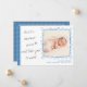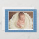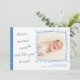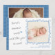 Personligens kort för födelseanmälan, med texten "det finns någon söt vi vill att du ska träffa". Den här söta designen har ett doodlat regnbågsfoto ram, ett litet kärlek hjärta och två tonlägen i blå nyanser. Fotomallen är inställd så att du kan lägga till 2 av bilderna som visas i kvadratiskt och liggande format. Du kan lägga till baby namn och födelsestatus på framsidan och bilden på baksidan har en ögonblicksbild av ram där du kan lägga till ditt eget namn.
