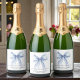 Eleganta etiketter för mousserande vin till bröllopsfest med en elegant vattenfärg av ett blått kokettband, "något blått innan jag gör" i modernt skrivsätt, och brudens namn och bröllopsfestens datum i enkel bokstav.