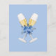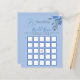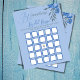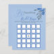 Elegant Calligraphy skriver något blått Möhippa Bröllop Bingo Funny Game med vattenfärgblommor. På andra sidan finns det ett glas champagne med en bukett.