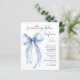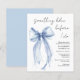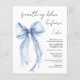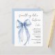 Elegantens budget inbjudningskort för möhippan med en delikat vattenfärg av en blå coquette-butik och "något blått före jag gör" i ett skript för chic. Den här pappra för halvblank i budgeten är ungefär lika viktig som fotopapper. Det finns också en tjockare version av det traditionella kortet lagrar 5 x 7 (meddelande om länken).