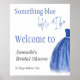 Elegant något blåtemat Möhippans välkomsttecken med blå kruka och kalligrafi i skriptcitattecken.