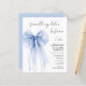 Elegantens budget inbjudningskort för möhippan med en vattenfärg av en stor blå coquette-båge och "något blått före mig" i ett skript för chic. Den här pappra för halvblank i budgeten är ungefär lika viktig som fotopapper. Det finns också en tjockare version av det traditionella kortet lagrar 5 x 7 (meddelande om länken).
