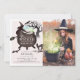 Halloween-flickans fotoinbjudan på födelsedagen innehåller en kauldron med rök i regnbåge färg, en häxa på en pjäs, en träd, fladdermus och en katt. Baksidan har en vit bakgrund med rosa diagonalt rand. Anpassa den efter dina behov. Du hittar matchande produkter i min butik.