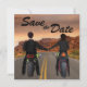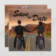 Den här unika Save the Date-inbjudan har en vacker motorvägssnål med en pojke och ett flickpar på motorcyklar som håller händer. Paret har brunt hår. Andra alternativ för hår färg finns tillgängliga på begäran! Perfekt för ett biker par! Anpassa enkelt detta Spara datum med all information om bröllop.