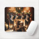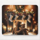 Två nallar sitter nära varandra framför en värmebelyst kamera omgiven av julklappar, dekorationer och ljusljus