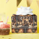 Två nallar sitter nära varandra framför en värmebelyst kamera omgiven av julklappar, dekorationer och ljusljus