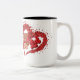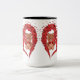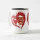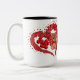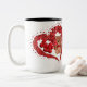 Ett vitt keramiskt mugg med en hjärtform som består av mindre röda hjärtan, med en söt brun nalle som håller ett litet rött hjärta inuti huvudhjärtat. Mugg har en svart fälg och handtag