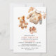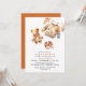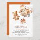 Kute från höstens babyduschinbjudningar med vattenfärgsillustrationer av en nalle och mysiga barnkläder. Enkel layout med en ljusbränd orange accent färg. Könsneutral utformning är perfekt för pojke eller flicka.