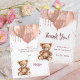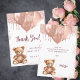 Ett tack för en babyskare. En vit bakgrund. Dekorerad med ro guld-ballonger, en söt nalle och faux-glitter. Tillbaka: Anpassa och lägg till tackkort och namn.