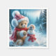 En brun nalle i en hatt, örlder och rödscarf bygger ett litet snögubbe på ett skogen på vintern